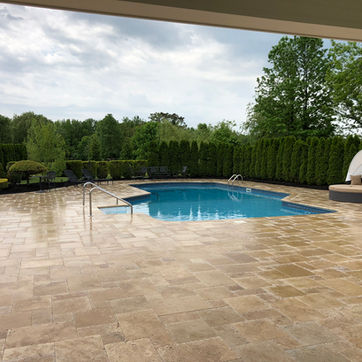 Our landscape design team had a huge canvas to work with, as the original poolscape suffered from outdated pavers and dull coping. Gorgeous natural stone (travertine) transformed the look, giving swimmers plenty of room to relax after a dip. When swimming’s over, it’s time to head to the 18’x18’ custom-built pavilion, to enjoy the warmth of the outdoor fireplace and a movie on the TV. Custom Azek columns and trim work complete this modern structure—and add to this landscape’s newfound beauty.